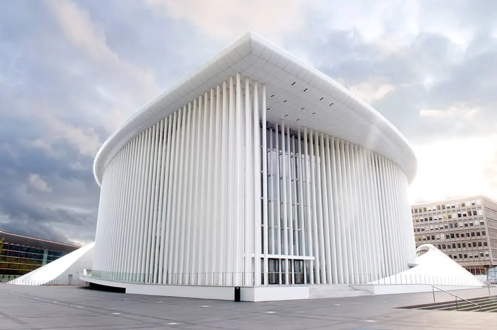 Une blancheur immaculée, une façade vitrée ouverte sur l’extérieur, des lignes courbes cerclées de plus de 800 colonnes élancées… L’architecte français n’a pas manqué d’audace. Ouvert aux visites, l’intérieur du « diamant » est quant à lui tout aussi captivant : un foyer circulaire baigné de lumière, trois salles de caractère pouvant accueillir de 150 à 1600 spectateurs, un balcon panoramique, et surtout, pas un angle qui ne se répète ou ne se ressemble. Du sol au plafond, partout de Portzamparc a voulu évoquer le son : sa forme, son mouvement, son impact sur nous. En plus de sa valeur esthétique, un tel procédé permet une acoustique optimale, notamment dans la salle principale, le Grand Auditorium.